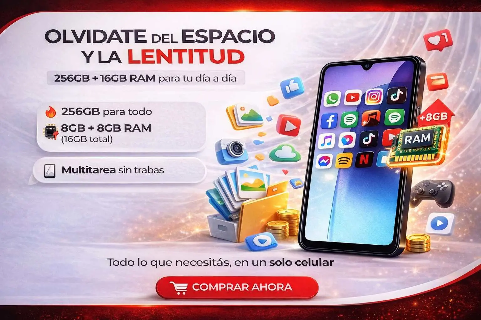 Con 256GB de almacenamiento y hasta 16GB de RAM, podés usar múltiples apps sin que se trabe.